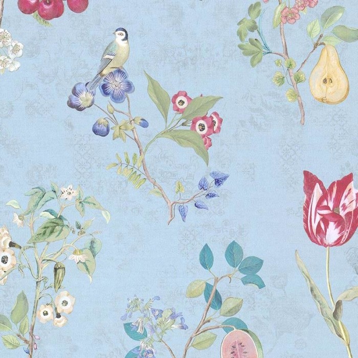 Papel pintado rústico con flores, pájaros y frutas, una opción alegre y campestre para decorar con encanto tradicional. Pip Studio de Eijffinger, papel de pared calidad tejido no tejido lavable. Medidas: 52 cm x 10 metros