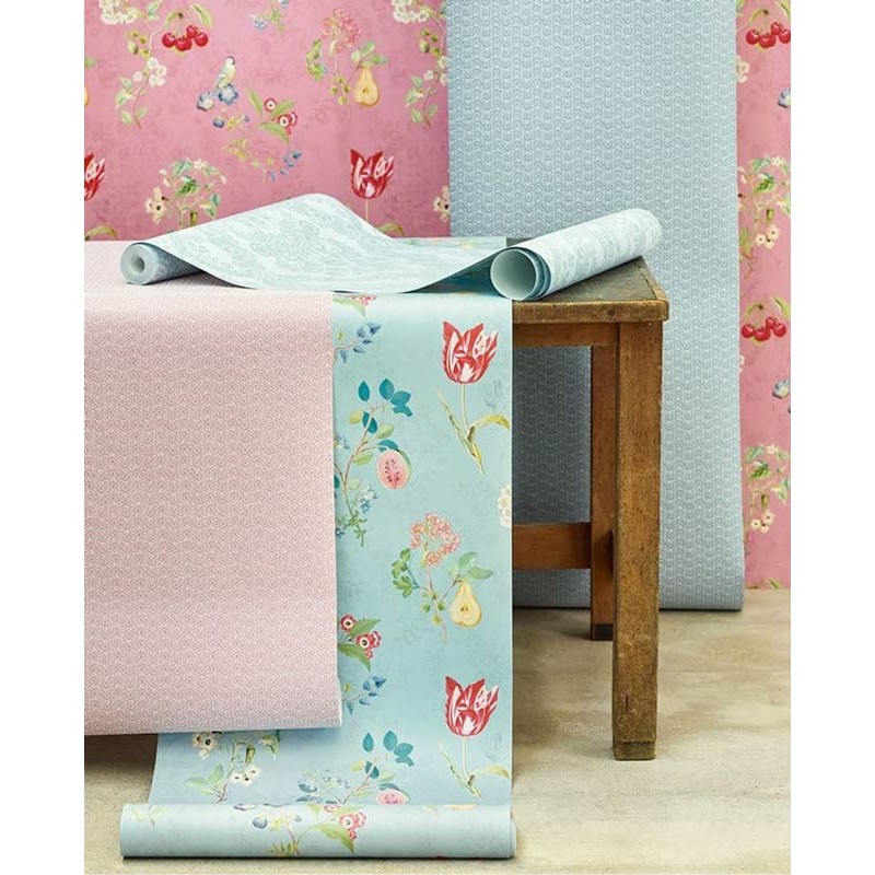 Papel pintado romántico con motivos frutales y rústicos, perfecto para un estilo entrañable y lleno de encanto. Pip Studio de Eijffinger, papel de pared calidad tejido no tejido lavable. Medidas: 52 cm x 10 metros