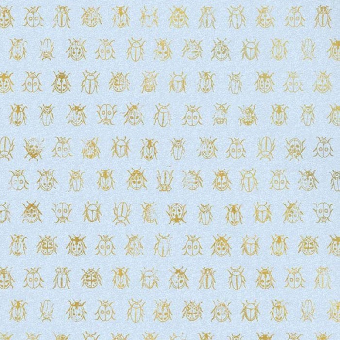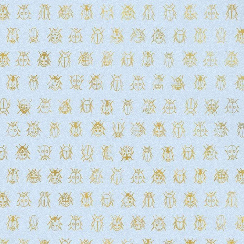 Papel pintado en azul celeste con insectos dorados metalizados, pensado para un estilo delicado con un toque brillante. Pip Studio de Eijffinger, papel de pared calidad tejido no tejido lavable. Medidas: 52 cm x 10 metros