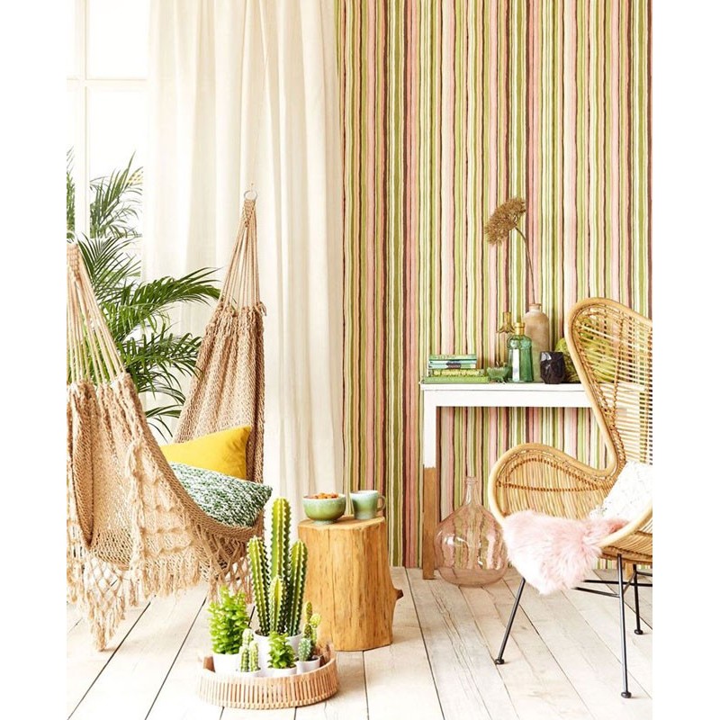 Papel pintado rayas multicolor tonos pastel. Decora con encanto en cualquier estancia de tu hogar. Combina con estilos modernos y clásicos.