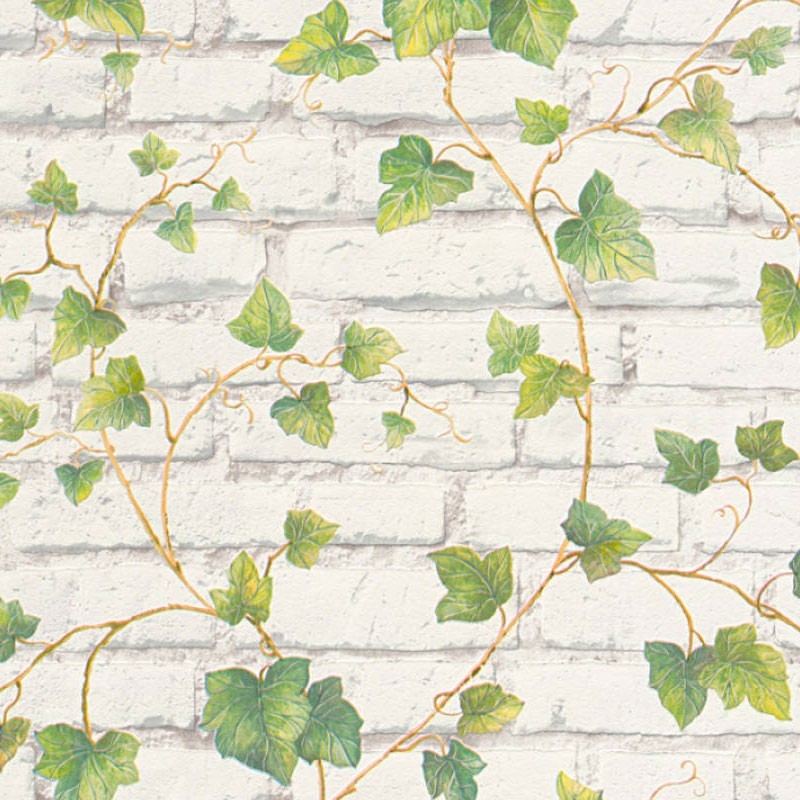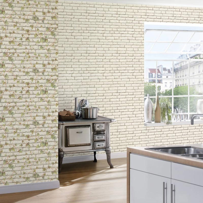 Este modelo de papel pintado ladrillo blanco con plantas, ideal para transformar cualquier espacio con estilo. Papeldecor 217-000158.