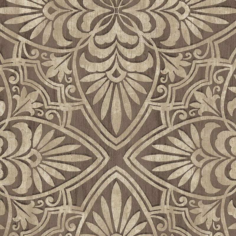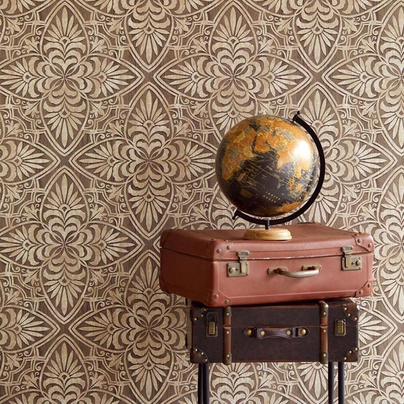 Papel pintado arabesco oriental tallado madera de Eijffinger, colección Sundari. Medidas: 52 cm x 10 m. Papel de pared tejido no tejido y lavable.