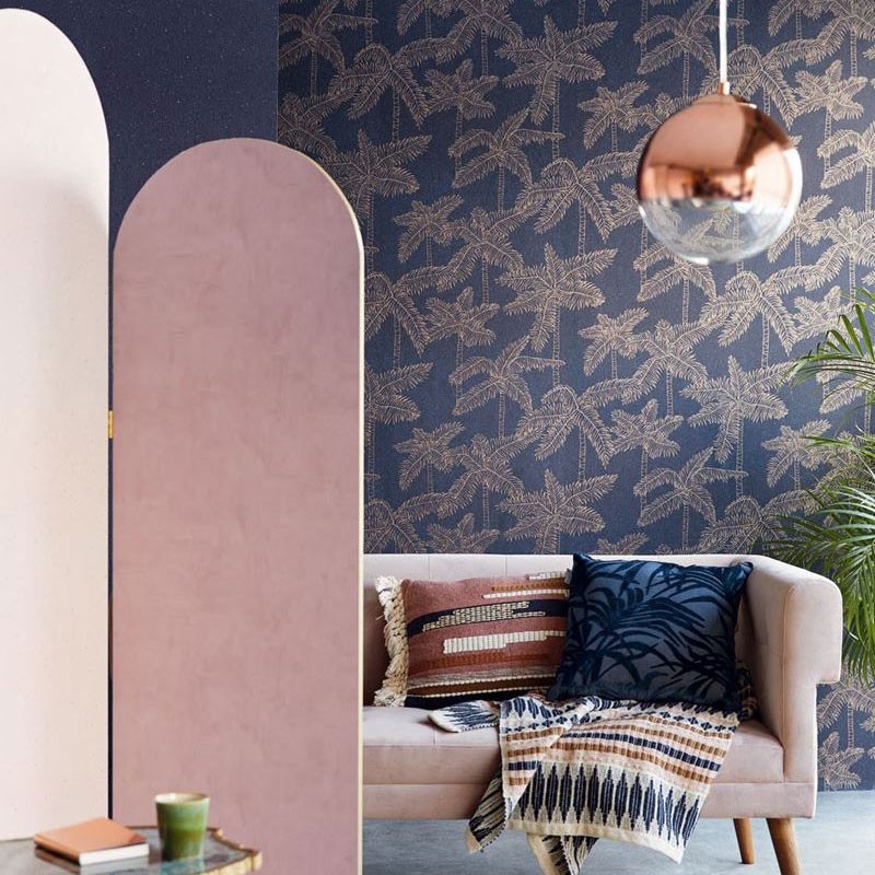 Papel pintado palmeras rosa pastel dorado metalizado de Eijffinger, colección Vivid. Medidas: 52 cm x 10 m. Papel de pared tejido no tejido y lavable.