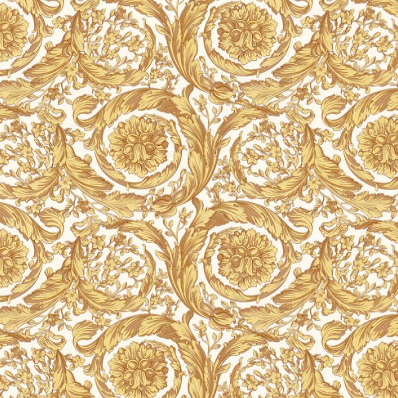 Papel pintado ornamental blanco y dorado metalizado Versace de gama alta, calidad vinílico y lavable. Medidas: 70 cm x 10 metros
