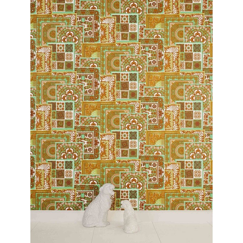 Papel pintado collage barroco clásico moderno verde y dorado Versace de gama alta, calidad vinílico y lavable. Medidas: 70 cm x 10 metros