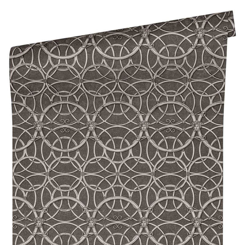 Papel pintado barroco clásico metalizado con círculos negros y grises Versace de gama alta, calidad vinílico y lavable. Medidas: 70 cm x 10 metros