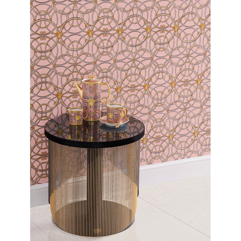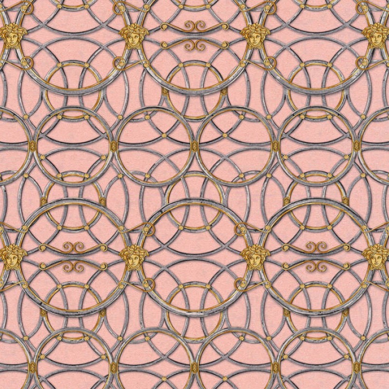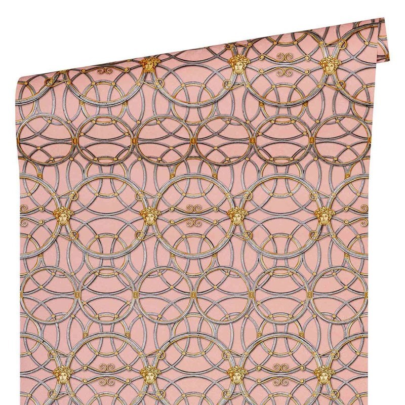 Papel pintado barroco clásico metalizado con círculos rosa y dorado Versace de gama alta, calidad vinílico y lavable. Medidas: 70 cm x 10 metros