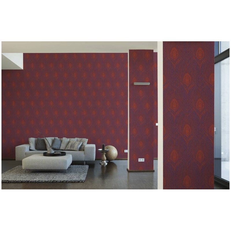 Papel pintado moderno plumas pavo real violeta y naranja. Vendido por rollo, medidas: 53 cm x 10 metros