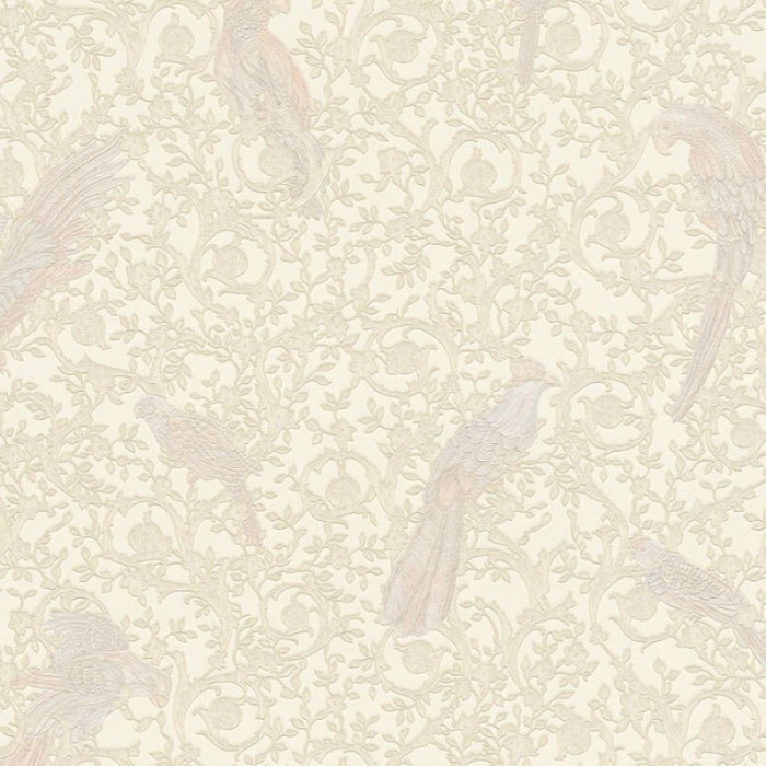 Papel pintado clásico barroco con pájaros y ornamentos blanco crema. Vendido por rollo, medidas: 70 cm x 10 metros