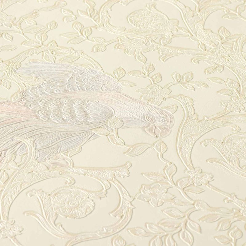 Papeldecor|Papel pintado clásico barroco con pájaros y ornamentos blanco crema|Papel Pintado