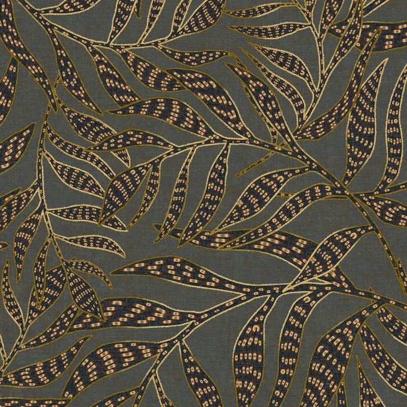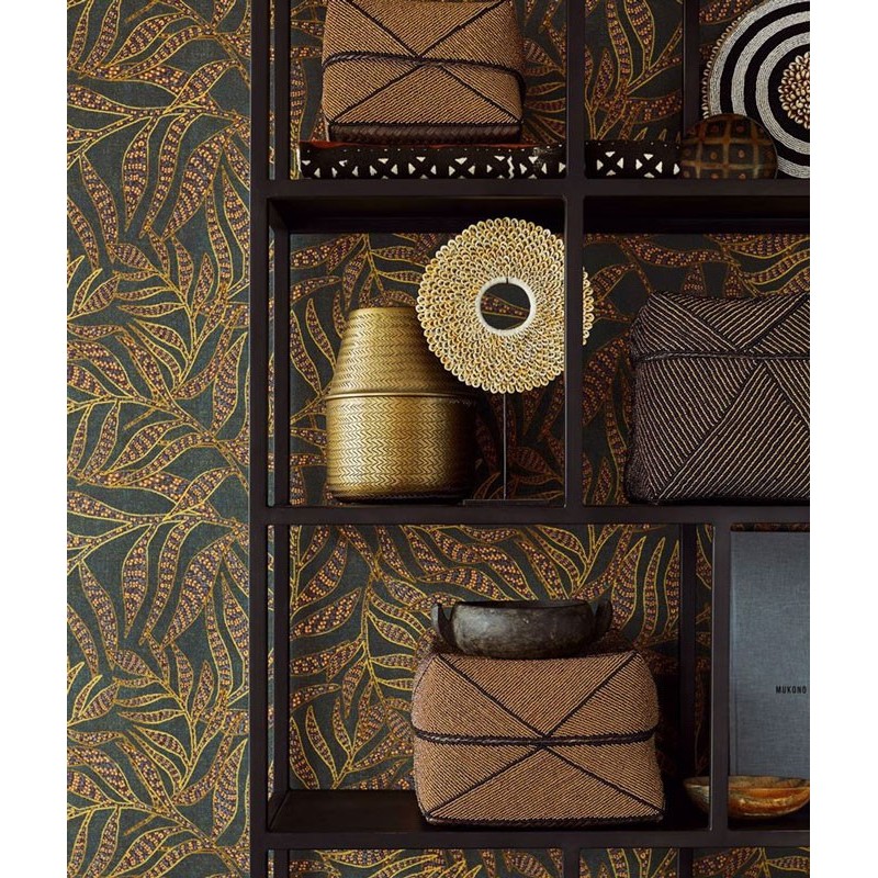 Papel pintado étnico moderno con hojas en relieve y brillo, azul y negro. Vendido por rollo, medidas: 52 cm x 10 metros