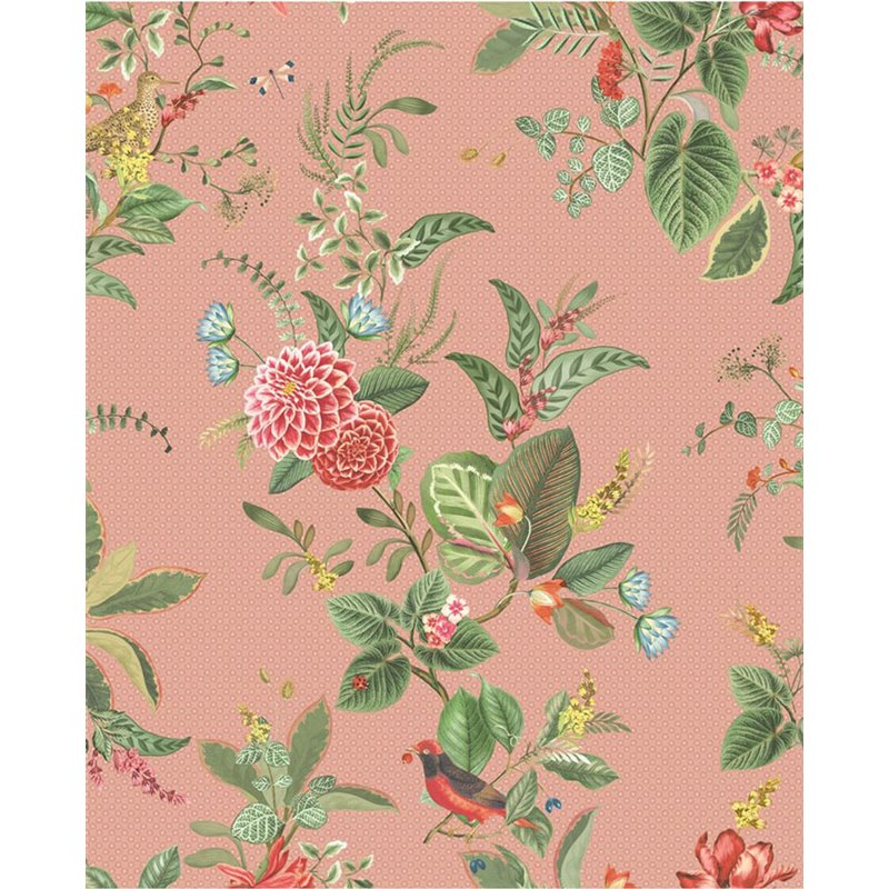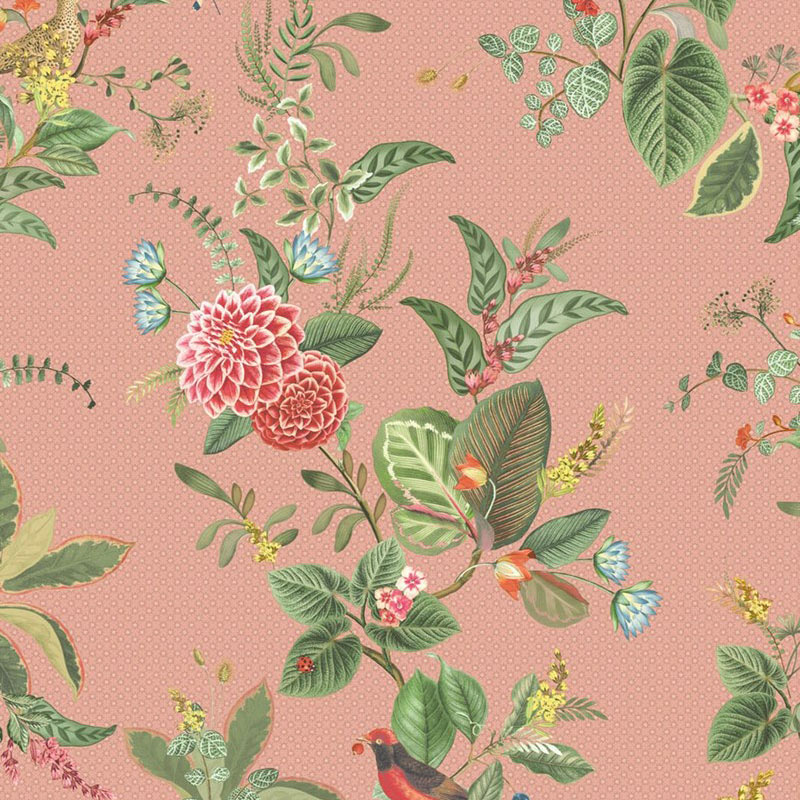 Papel pintado romántico rosa con flores verdes y pájaros multicolor, un diseño alegre y lleno de vida. Pip Studio de Eijffinger, papel de pared calidad tejido no tejido lavable. Medidas: 52 cm x 10 metros