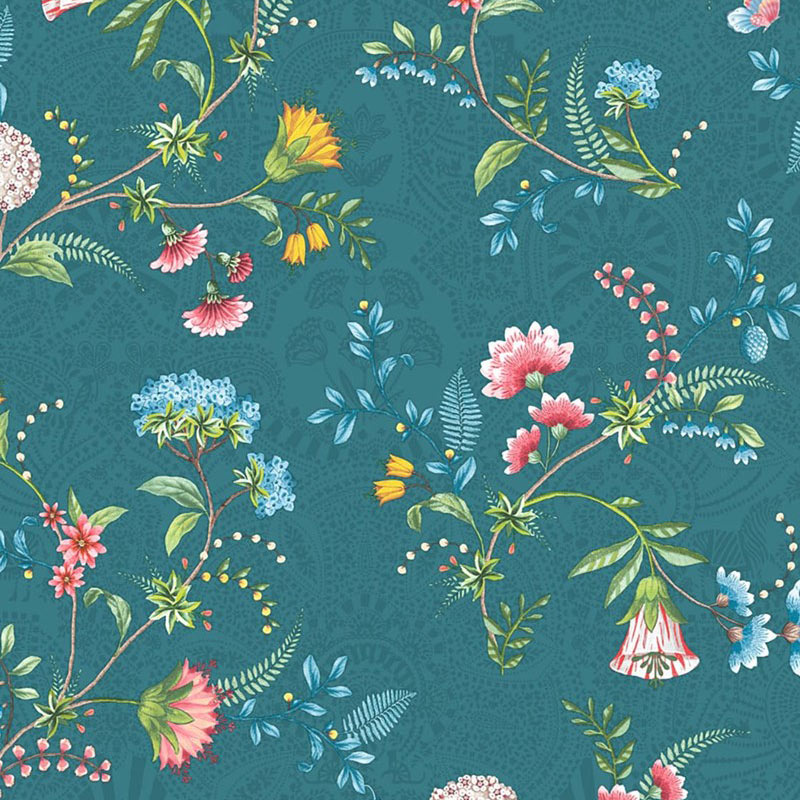 Papel pintado azul con flores multicolor románticas, un diseño alegre y decorativo para ambientes modernos. Pip Studio de Eijffinger, papel de pared calidad tejido no tejido lavable. Medidas: 52 cm x 10 metros