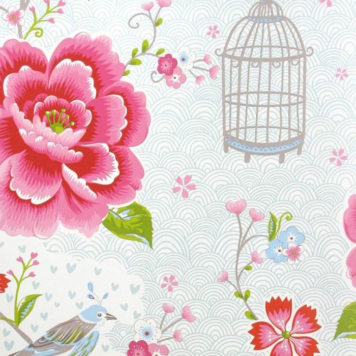 Papel pintado romántico con flores y pájaros en tonos rosas, una propuesta delicada y alegre para el hogar. Pip Studio de Eijffinger, papel de pared calidad tejido no tejido lavable. Medidas: 53 cm x 10 metros