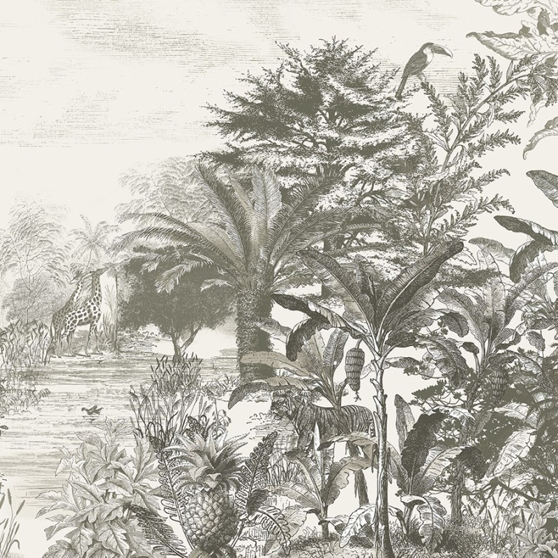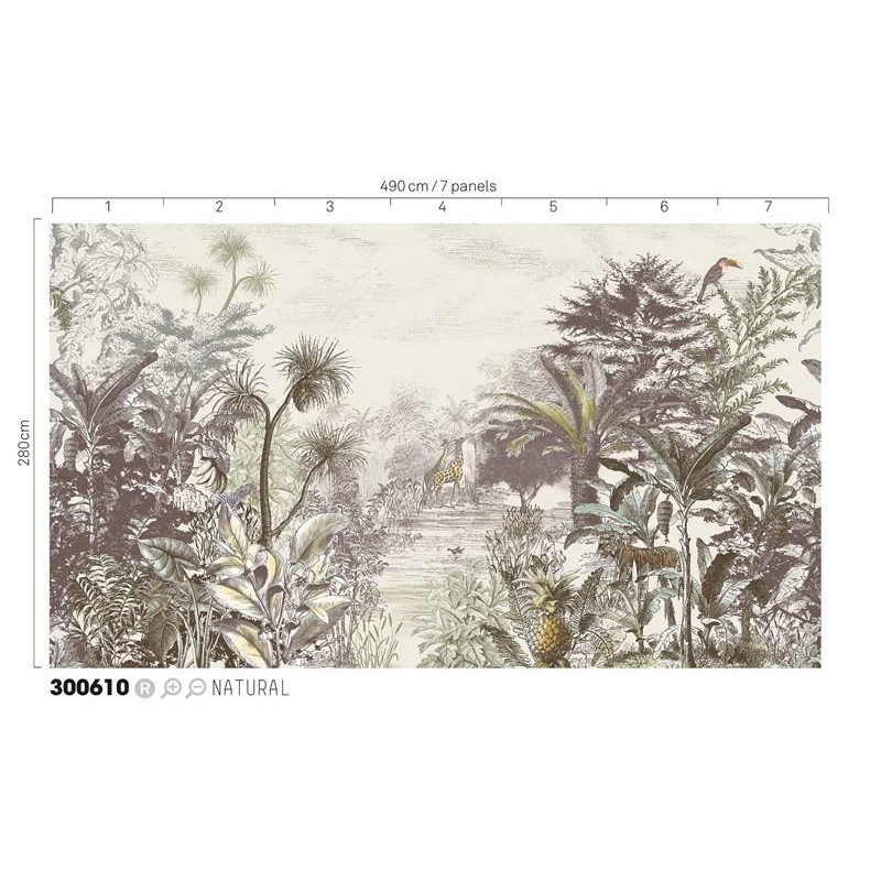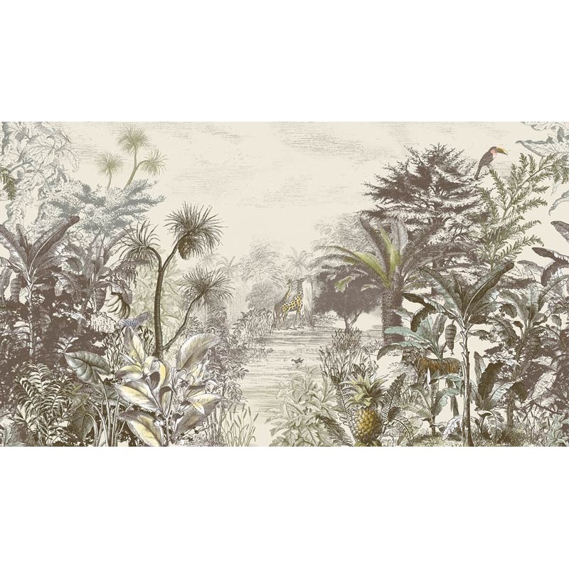 Mural pared paisaje safari en la jungla de Eijffinger, colección Skin. Medidas: 210 x 280 cm.