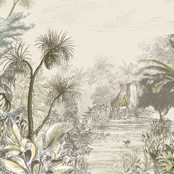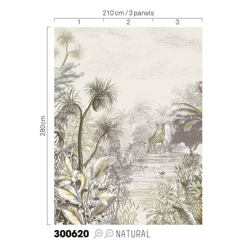 Mural pared paisaje safari en la jungla de Eijffinger, colección Skin. Medidas: 210 x 280 cm.