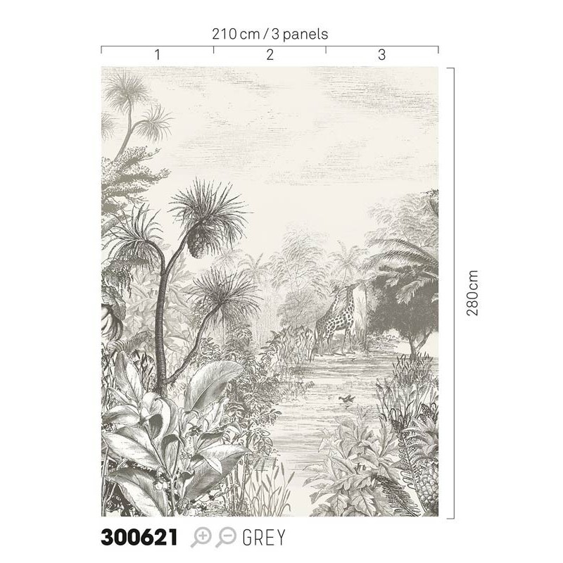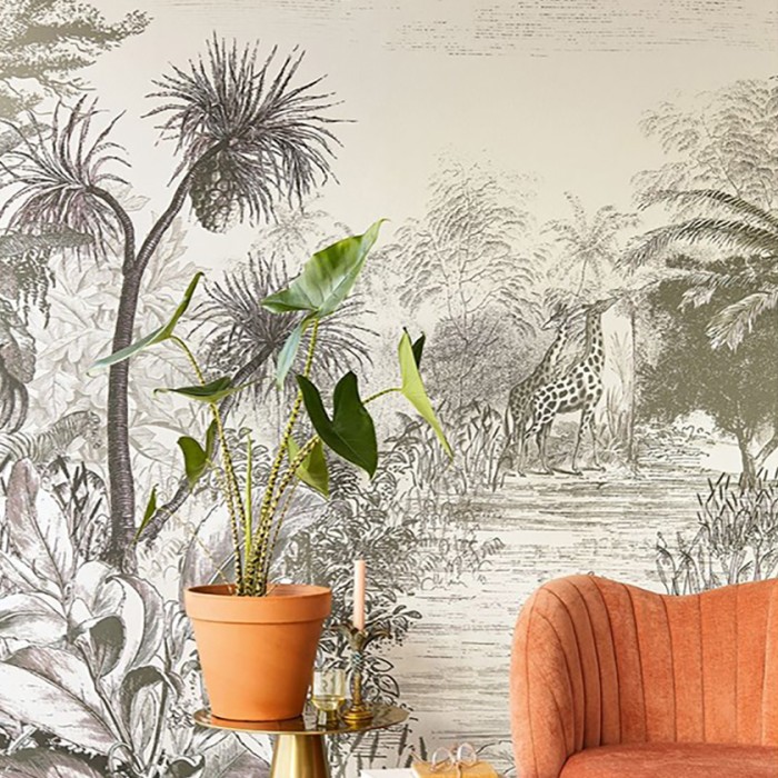 Mural pared paisaje safari en la jungla de Eijffinger, colección Skin. Medidas: 210 x 280 cm.