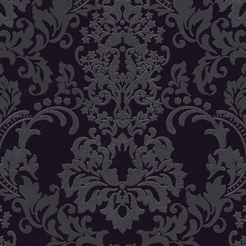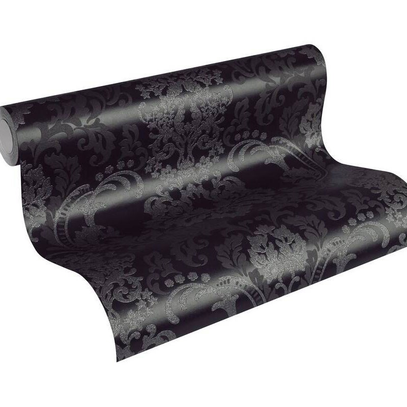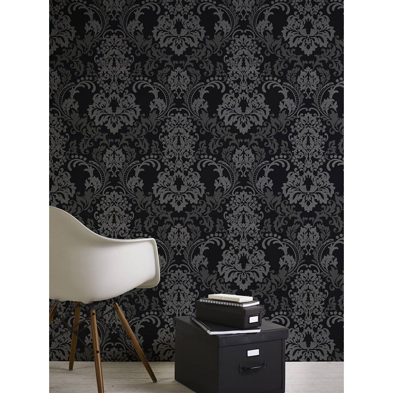 Papel pintado damasco negro y plateado con brillo. Ideal para lograr estilo clásico y detalles modernos. Papeldecor 220-3780