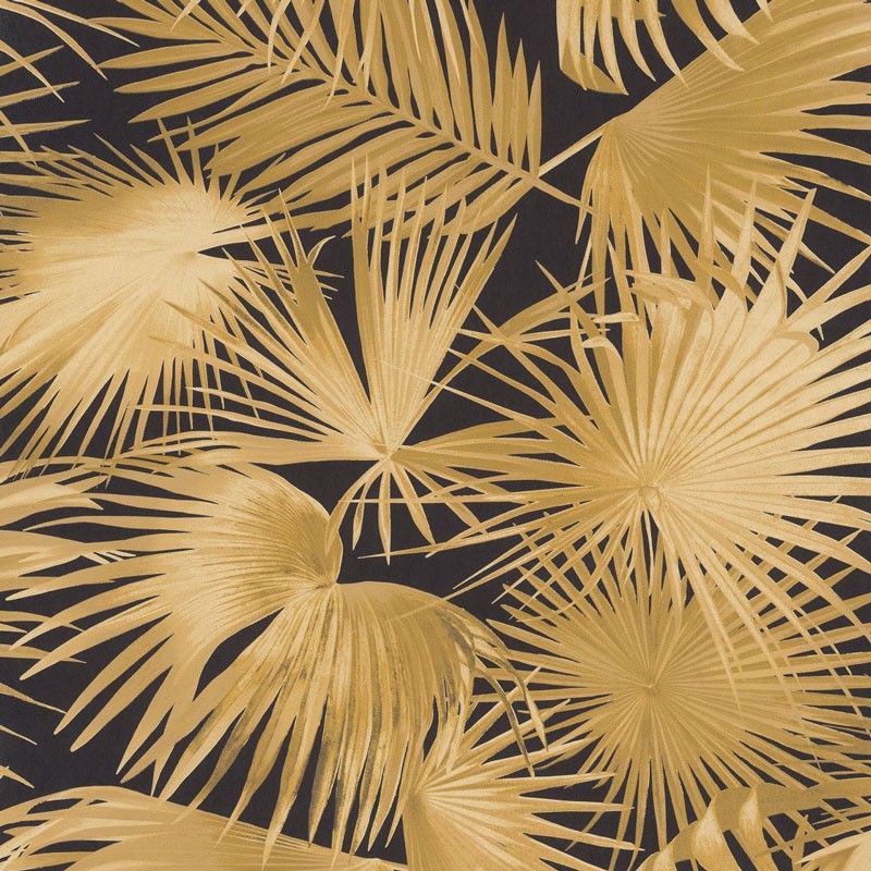 Papel Pintado moderno hojas de palmera tropical amarillo y negro con brillo de Khroma, colección Wild. Calidad tejido no-tejido lavable, medidas: 53 cm x 10 m.