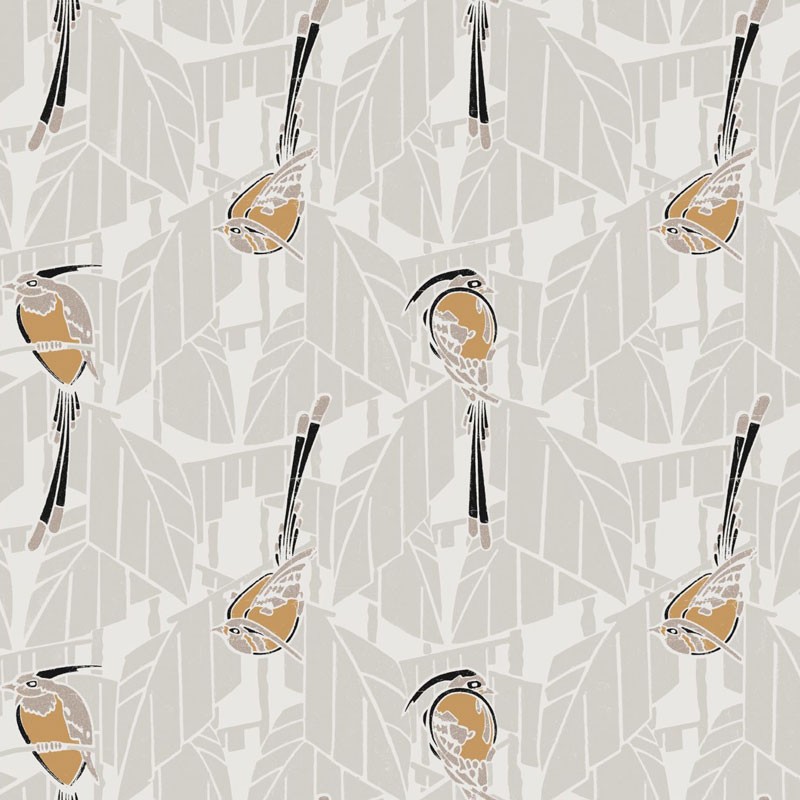 Papel Pintado mosaico Art-Deco de pájaros y formas geométricas de Khroma, colección Folies. Calidad tejido no-tejido lavable, medidas: 70 cm x 10 m.