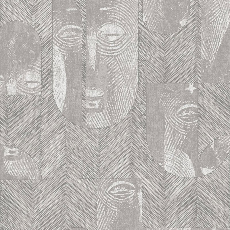 Papel Pintado africano con máscaras de estilo étnico gris de Khroma, colección Tribute. Calidad tejido no-tejido lavable, medidas: 53 cm x 10 m.