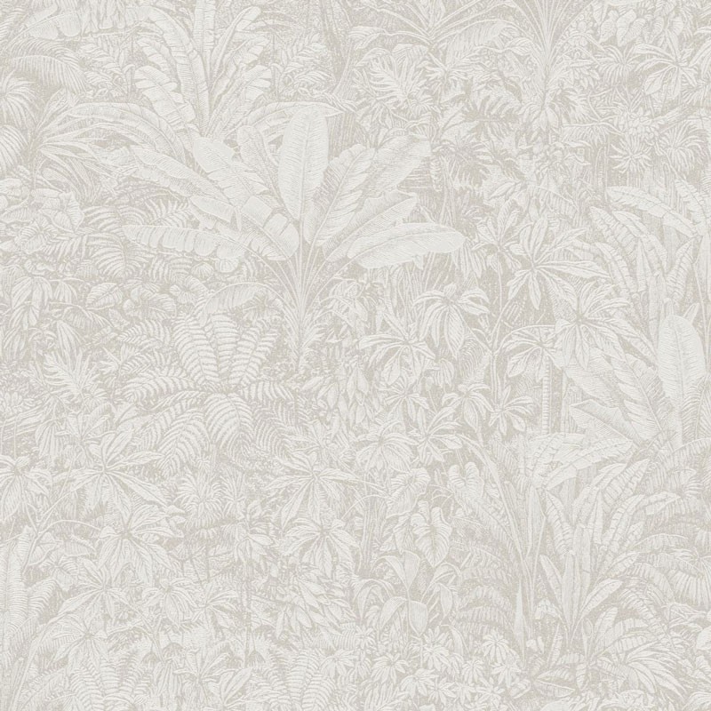Papel Pintado jungla tropical beige claro con vegetación de Khroma, colección Cabinet Of Curiosities. Calidad tejido no-tejido lavable, medidas: 53 cm x 10 m.