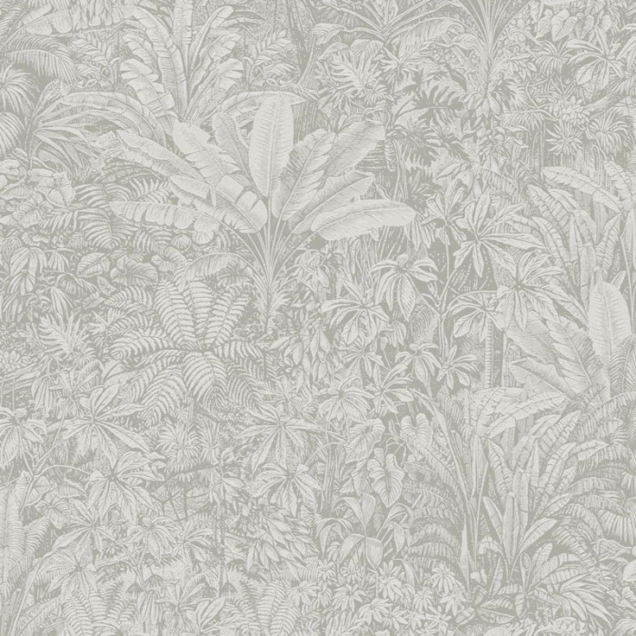 Papel Pintado floral gris estilo selva tropical de Khroma, colección Cabinet Of Curiosities. Calidad tejido no-tejido lavable, medidas: 53 cm x 10 m.