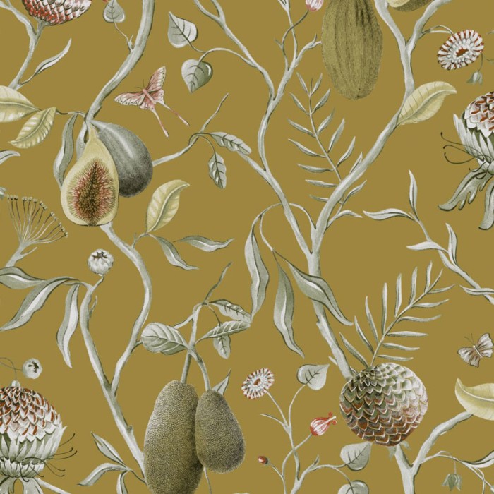 Papel Pintado frutas tropicales amarillo mostaza de Khroma, colección Cabinet Of Curiosities. Calidad tejido no-tejido lavable, medidas: 53 cm x 10 m.