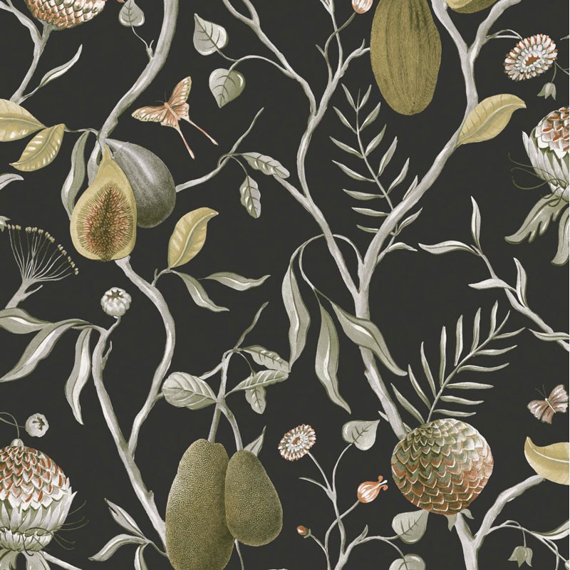 Papel Pintado negro con papayas tropicales de Khroma, colección Cabinet Of Curiosities. Calidad tejido no-tejido lavable, medidas: 53 cm x 10 m.