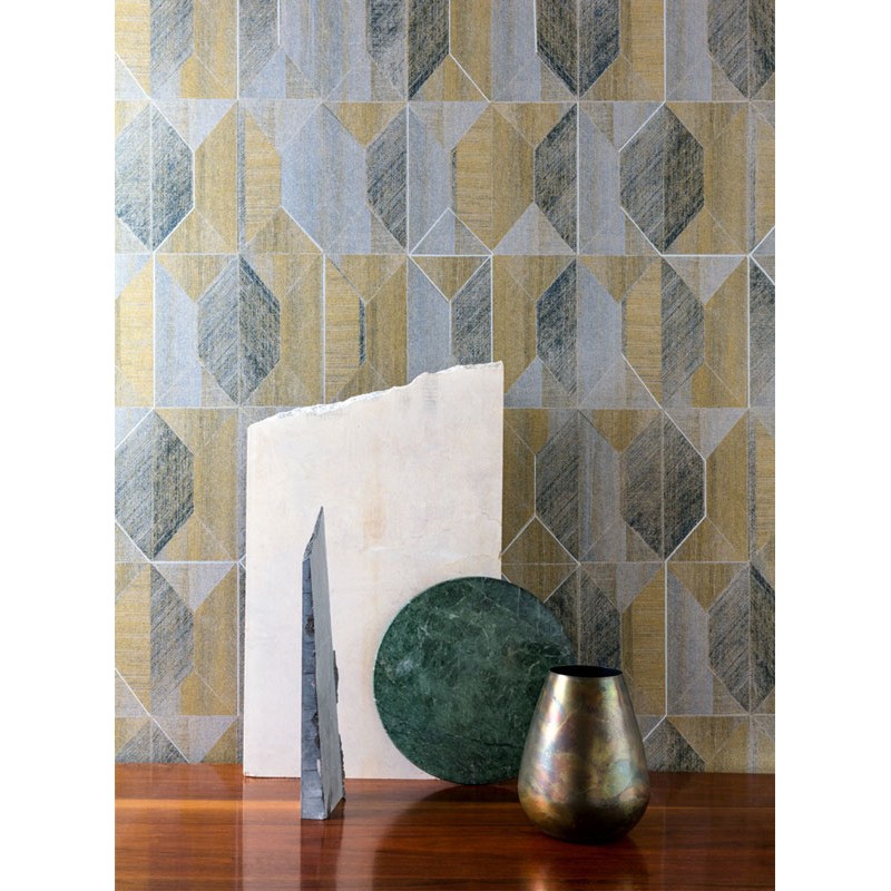 Papel pintado patrón gráfico de marquetería marrón que transmite elegancia y un aire artesanal. Medidas del rollo: 1 x 10 metros