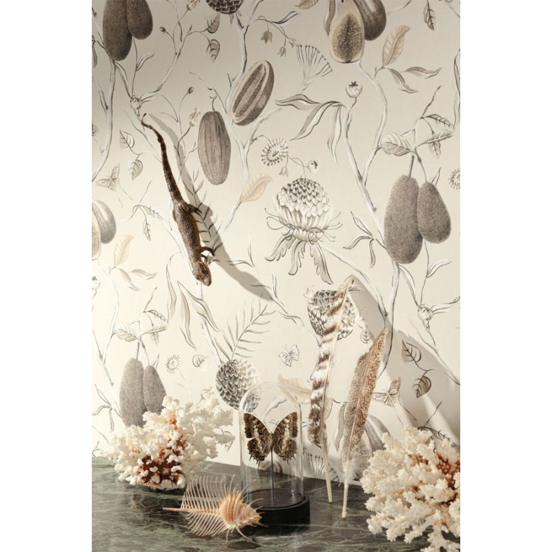 Papel pintado dibujo a mano alzada con papayas tropicales blanco crema. Vendido por rollo, medidas: 53 cm x 10 metros