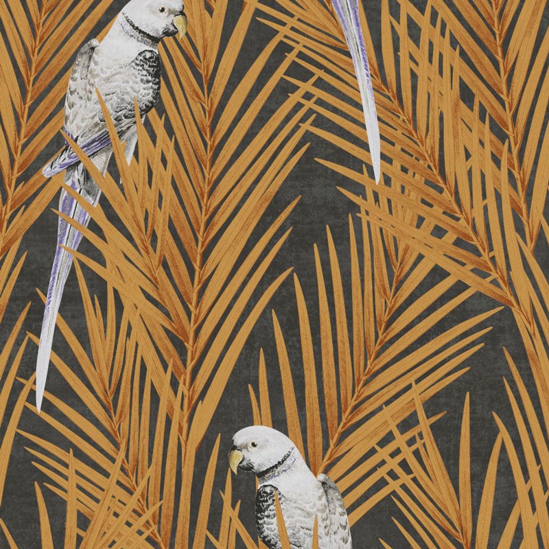 Papel pintado tropical hojas de palmeras y loros, tonos naranja. Vendido por rollo, medidas: 53 cm x 10 metros