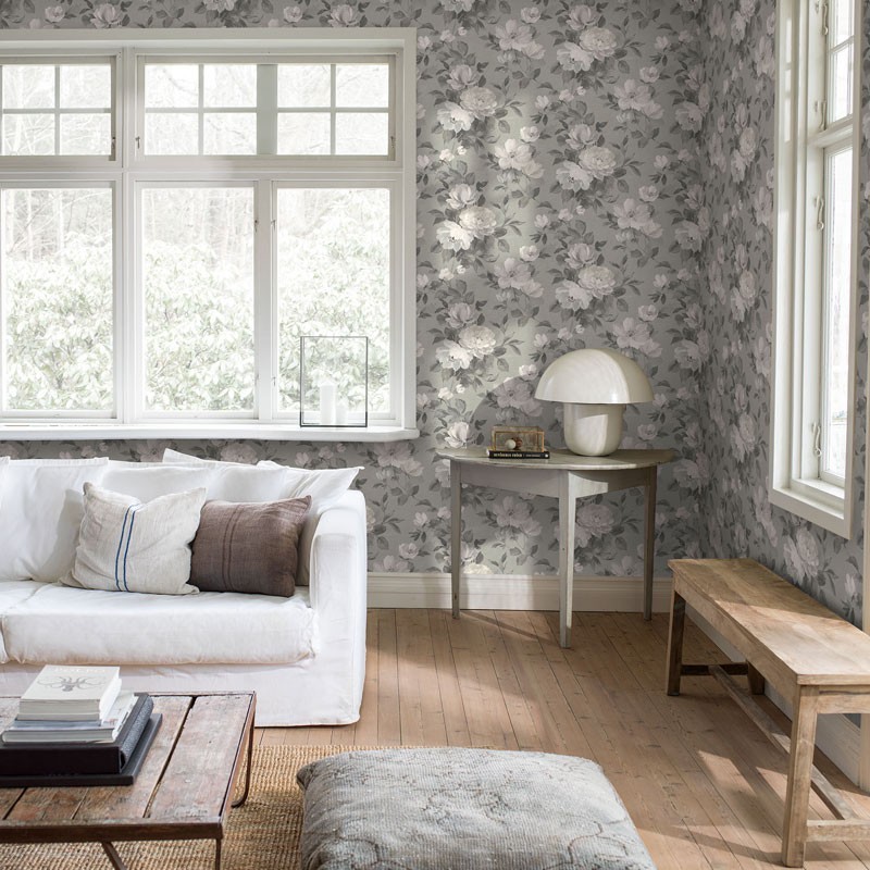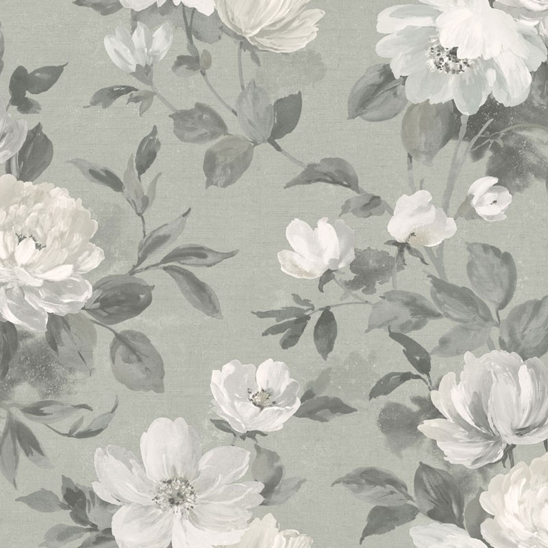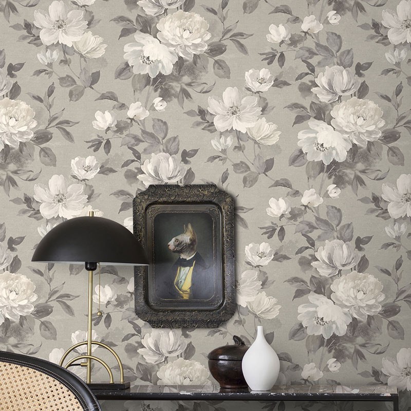 Papel pintado floral gris plateado