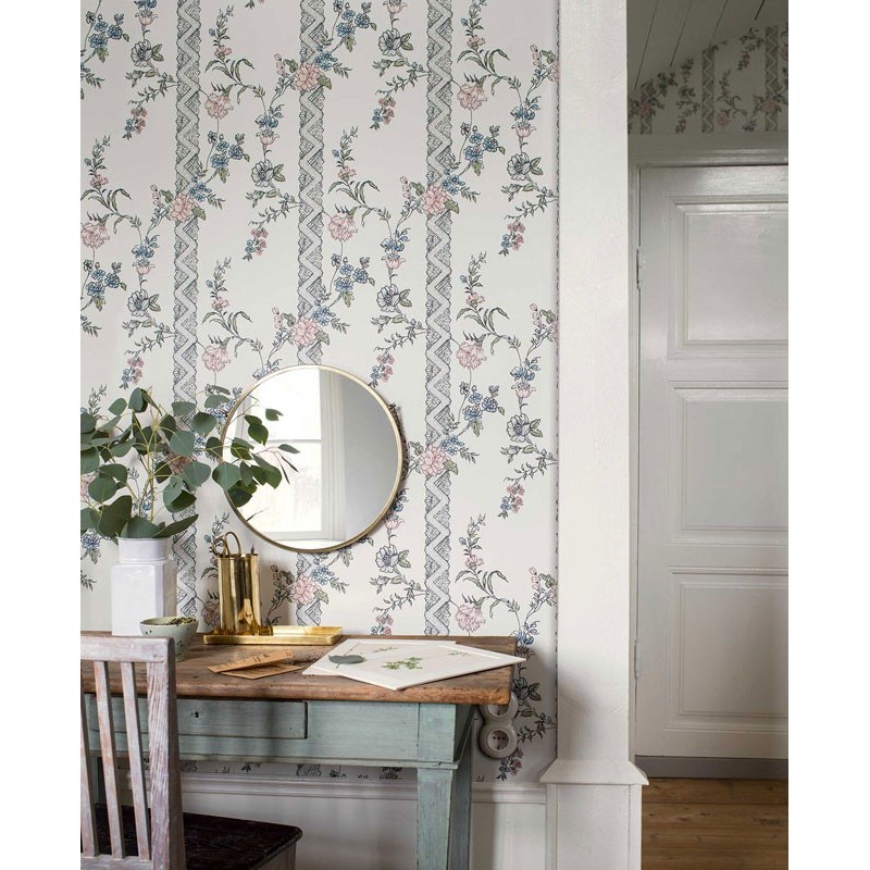 Papel pintado flores bandas gris azulado de Borastapeter, colección Anno. Calidad tejido no-tejido lavable, medidas: 53 cm x 10 m.