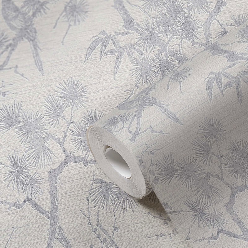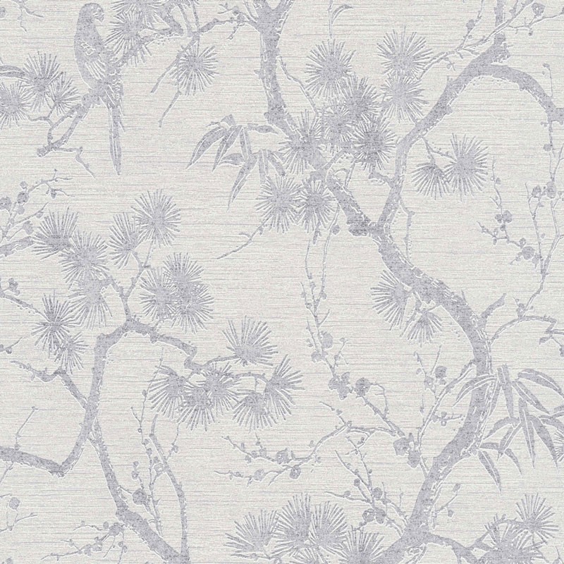 Papel Pintado bonsáis japoneses blanco y gris metalizado