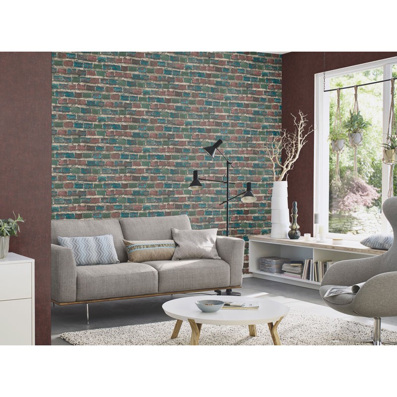 Inspirado en materiales auténticos, papel pintado ladrillo marrón, ideal para transformar cualquier espacio con estilo. Papel Pintado Rasch Factory IV 428056.