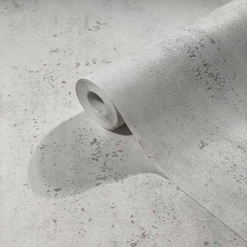 Papel pintado hormigón blanco con parches metalizados, ideal para interiores con estilo. Marburg City Glam 32611.