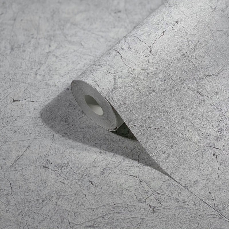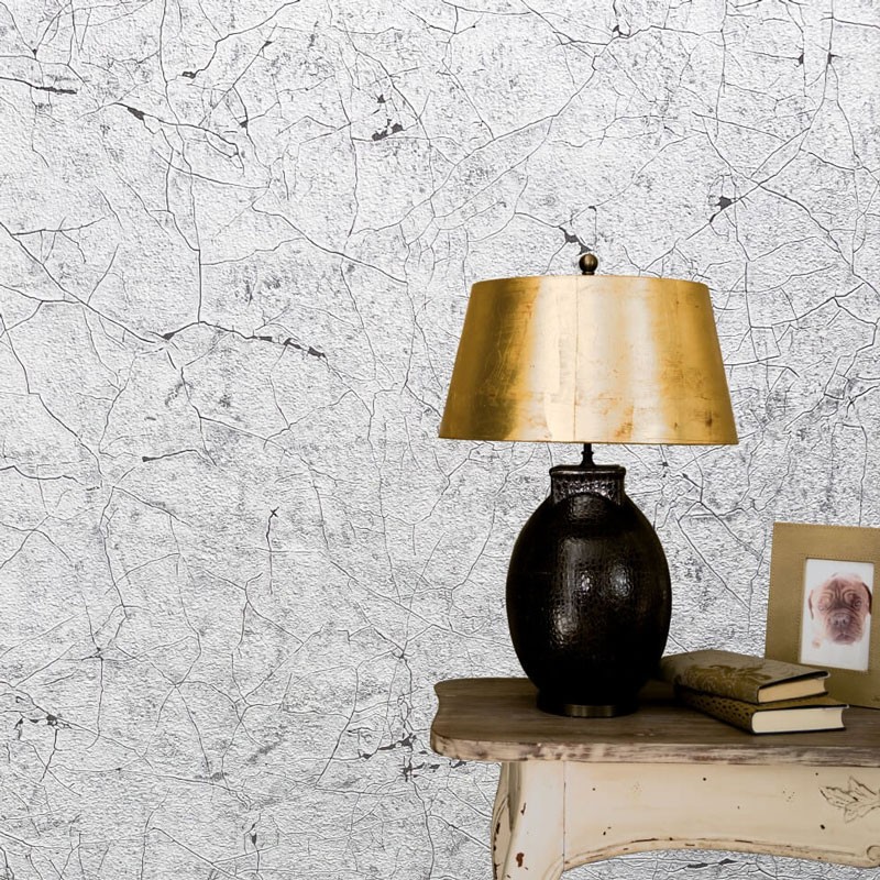 Papel pintado estilo industrial yeso gris agrietado, perfecto para proyectos de interiorismo. Marburg Vintage 32803.
