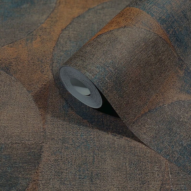 Una opción decorativa con gran carácter es papel pintado estilo industrial semicírculos marrón azul Marburg Vintage 32822.