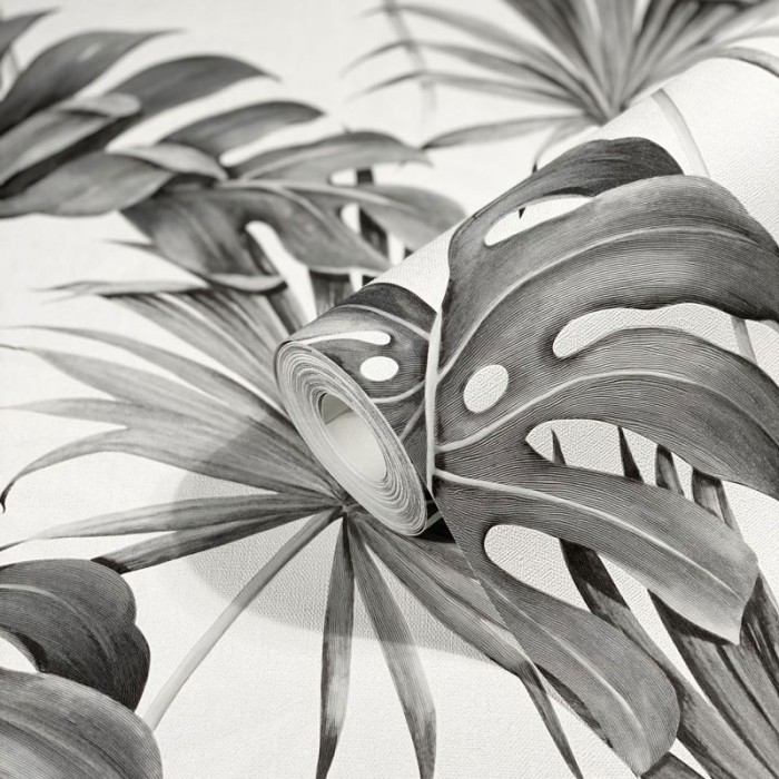 Diseñado para transformar tus espacios, papel pintado tropical hojas grandes verde y gris Marburg New Spirit 32746.