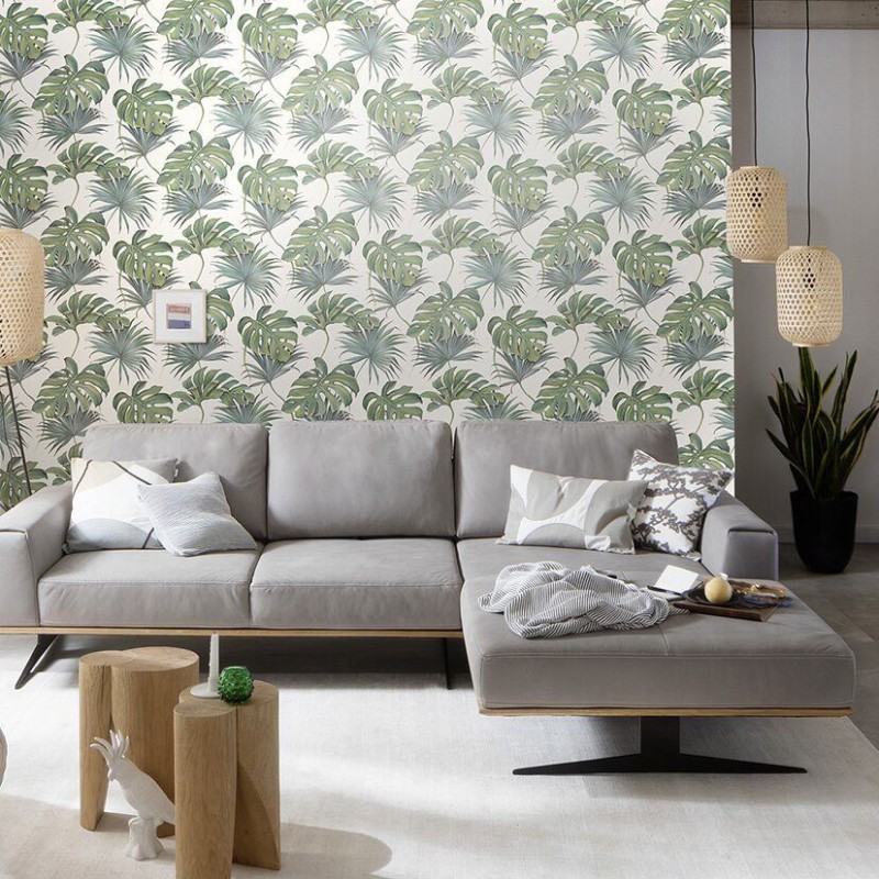Diseñado para transformar tus espacios, papel pintado tropical hojas grandes verde y gris Marburg New Spirit 32746.