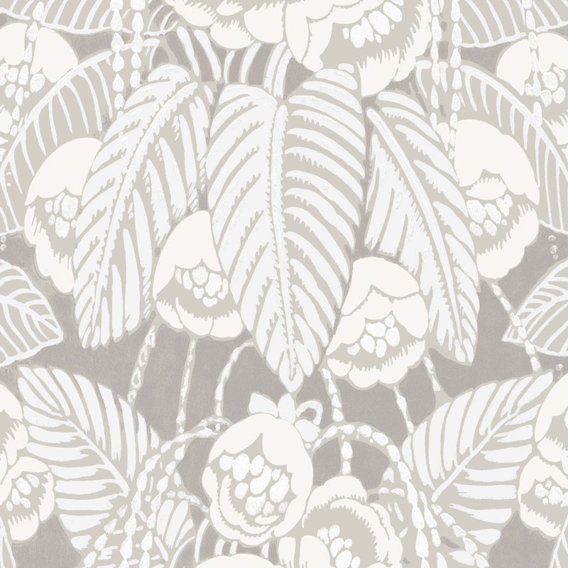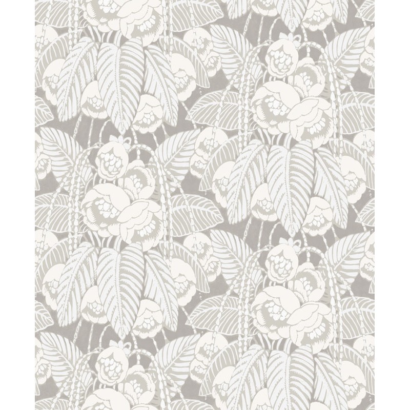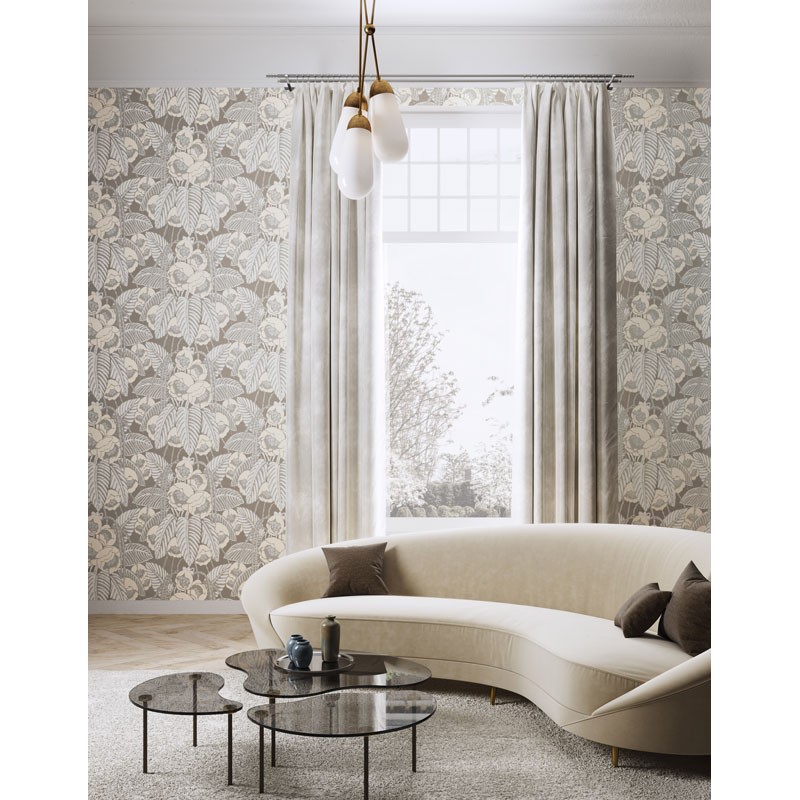 Papel Pintado floral beige y gris con detalles brillantes de Khroma, colección Agathe. Calidad tejido no-tejido lavable, medidas: 53 cm x 10 m.