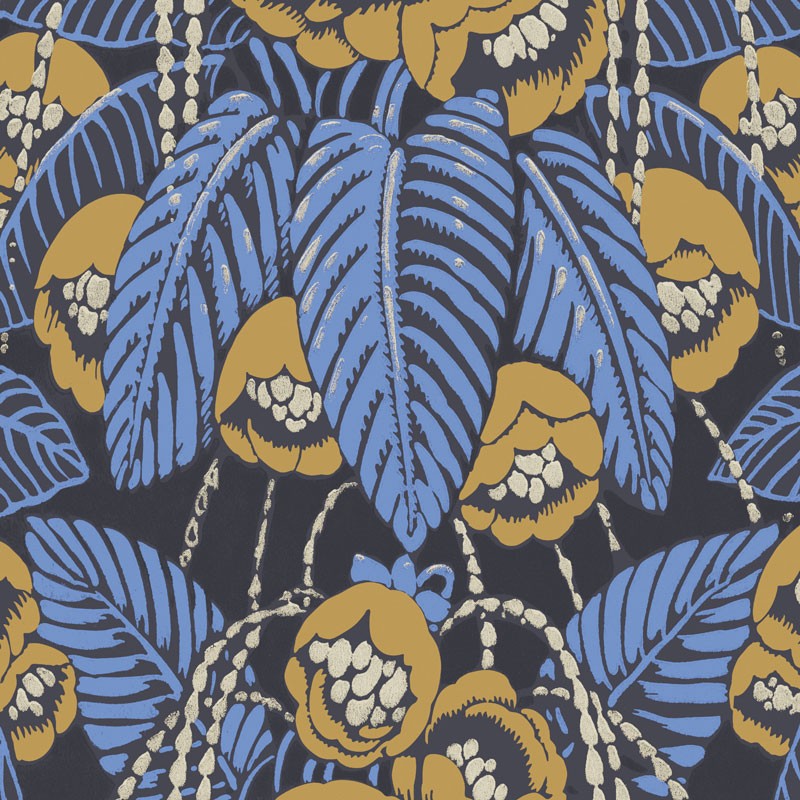 Papel Pintado floral azul y dorado con brillo sobre negro