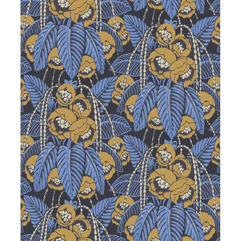 Papel Pintado floral azul y dorado con brillo sobre negro de Khroma, colección Agathe. Calidad tejido no-tejido lavable, medidas: 53 cm x 10 m.