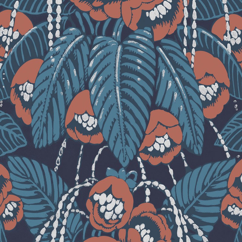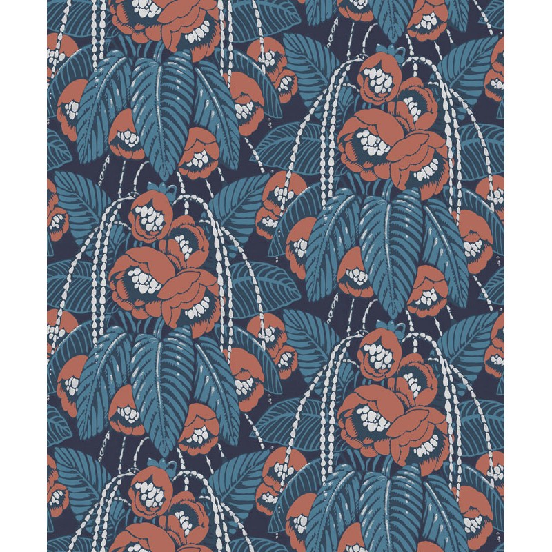 Papel Pintado flores exóticas con detalles metalizados azul y rojo de Khroma, colección Agathe. Calidad tejido no-tejido lavable, medidas: 53 cm x 10 m.