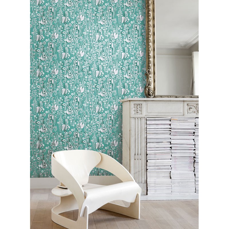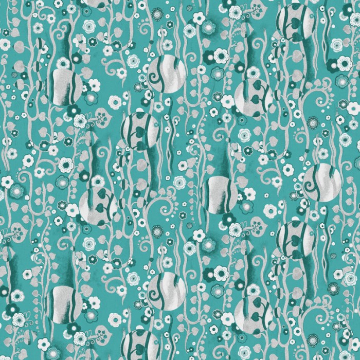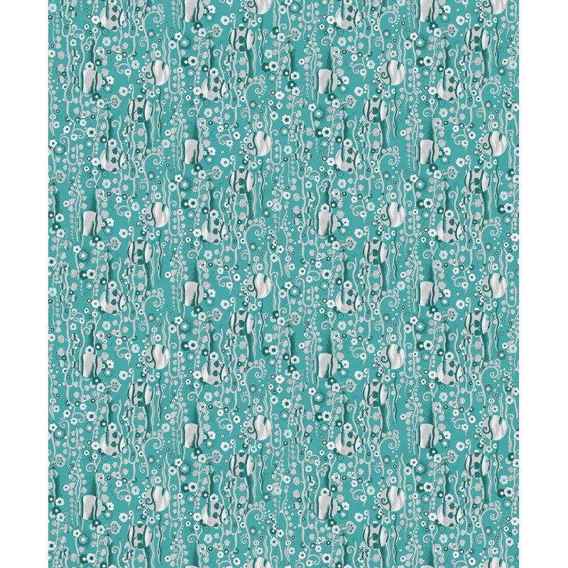 Papel Pintado floral abstracto turquesa y plata con brillo de Khroma, colección Agathe. Calidad tejido no-tejido lavable, medidas: 53 cm x 10 m.