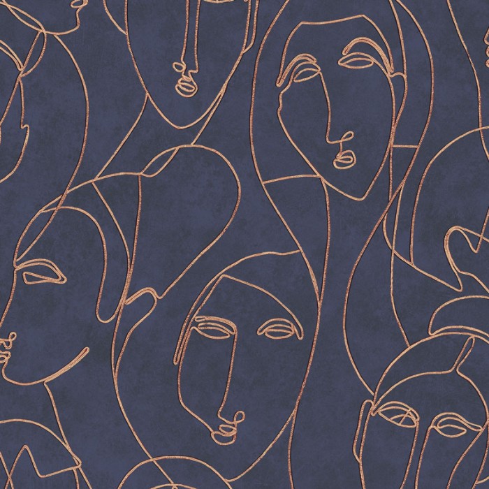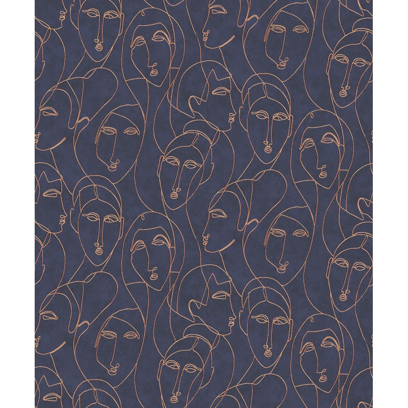 Papel Pintado rostros egipcios azul y bronce metalizado de Khroma, colección Agathe. Calidad tejido no-tejido lavable, medidas: 53 cm x 10 m.