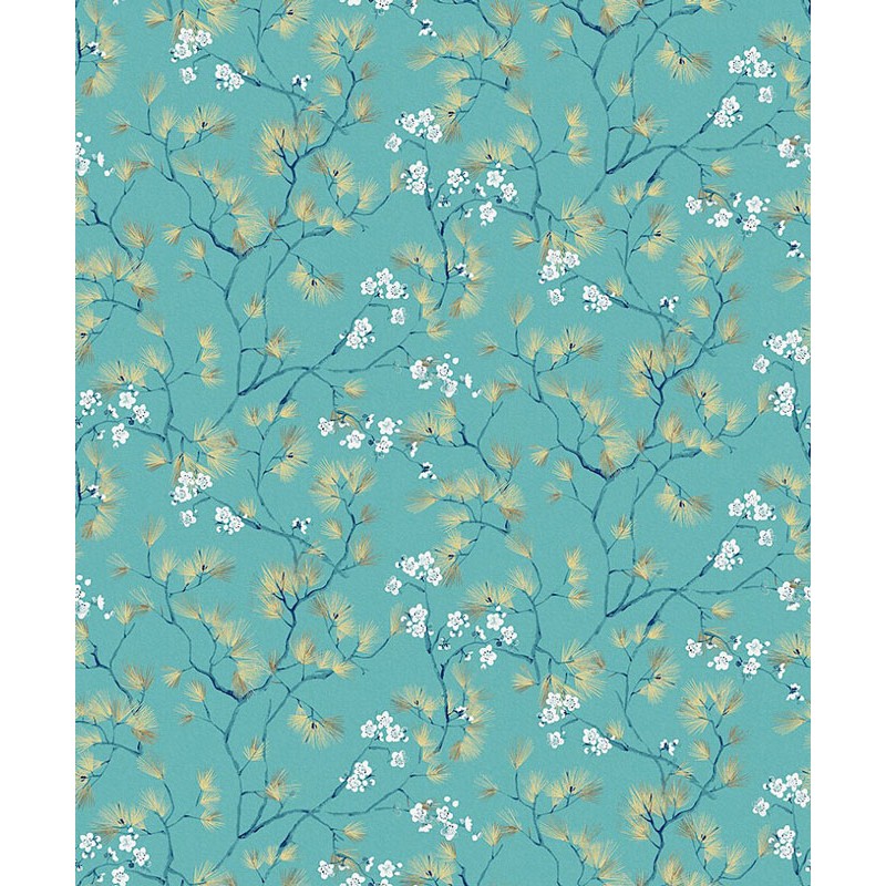 Papel Pintado cerezo en flor verde y dorado estilo oriental de Khroma, colección Kimono. Calidad tejido no-tejido lavable, medidas: 53 cm x 10 m.