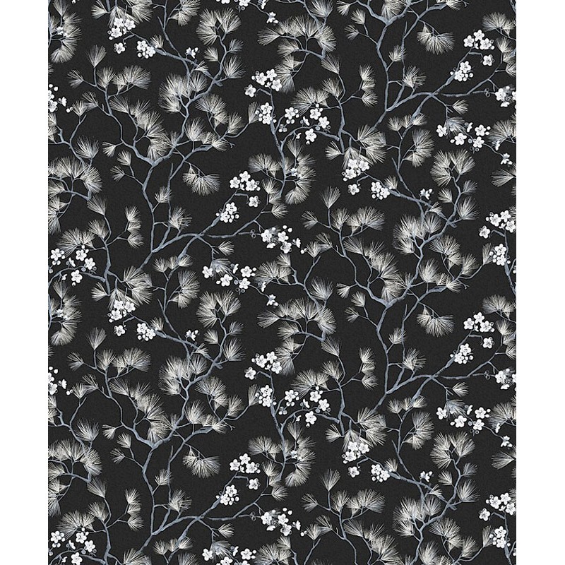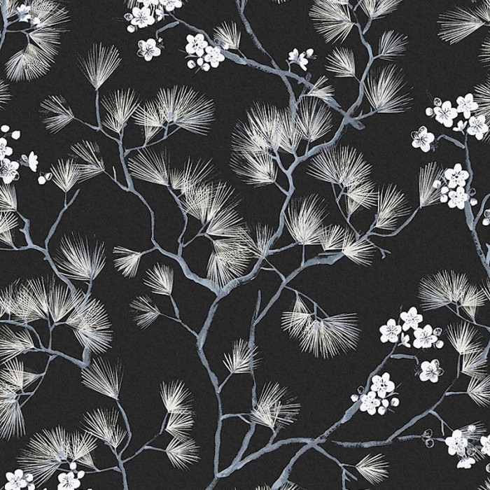 Papel Pintado cerezo japonés en flor sobre fondo negro de Khroma, colección Kimono. Calidad tejido no-tejido lavable, medidas: 53 cm x 10 m.