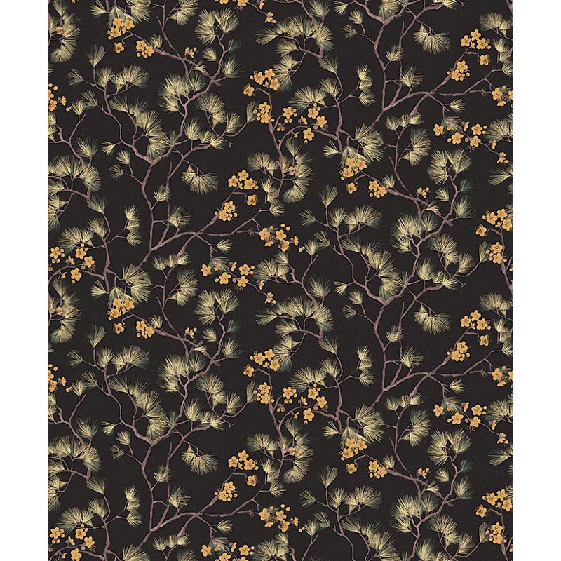 Papel Pintado cerezo japonés negro y verde de Khroma, colección Kimono. Calidad tejido no-tejido lavable, medidas: 53 cm x 10 m.